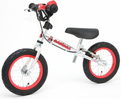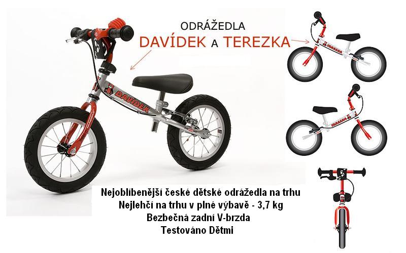 dětské odrážecí kolo DAVÍDEK a TEREZKA vyniká svou lehkostí (3,7Kg) a děti jej snadno zastaví i nohama. K bezpečnému zabrždění nebo kontrole rychlosti při jízdě ze strmého svahu poslouží zadní V-brzda, která je dostatečně citlivá a jejíž páčka je varovaná s ohledem na drobné dětské prstíky. 12´´kola s aluminiovým ráfkem jsou opatřena kuličkovými ložisky. Pneumatiky, vybavené nafukovací duší, jsou dostatečně měkké, přestože dezén je pevný a přilnavý za jakéhokoliv počasí. Davídek je vhodný pro děti od 2 do 5 let věku. Potom " přestoupí " na šlapací kolo, bez jakéhokoliv trénování rovnováhy.